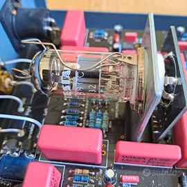 Circuito di uscita: Uscita valvolare con valvola russa Electro Harmonix 6922 (E88CC) su zoccolo (quindi upgradabile) e uscita a transistor.