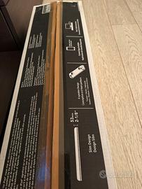 YAMAHA YAS 105, un modello dotato di 2.1 canali. Il design utilizza un profilo "ultra-slim", con uno sviluppo ridotto in altezza. La soundbar può essere installata sia in orizzontale, davanti o sotto la TV, sia in verticale, per chi preferisce la collocazione a parete. Il suono viene diffuso tramite due trasduttori a larga banda da 2-1/8" (fungono da canali frontali) due tweeter da 3/4" e da due subwoofer da 3". L'erogazione è pari a 30W x 2 per i frontali, mentre il subwoofer garantisce una potenza di 60W.