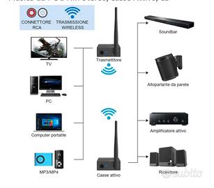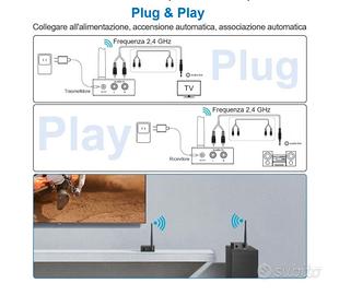 γππππππ§ππ¨ πΏππ¨πππ£ πͺπ£π πππ£ππππππ§ πΌπ£π¨πππ‘πͺπ¨π¨γKit ricevitore wireless YMOO con design abbastanza sicuro, anti-goccia e anti-collisione. L'ingresso e l'uscita RCA possono essere facilmente collegati al televisore, al lettore DVD o al lettore MP3 e trasmettere l'audio in modalitΓ wireless Un altoparlante attivo o una soundbar. Il trasmettitore Γ¨ per il vostro televisore/PC/lettore MP3, il ricevitore per il vostro altoparlante. Il trasmettitore e il ricevitore wireless si accendono automaticamente e si collegano automaticamente. γππ¬π¬π’ ππππππ¬πππ©πγTrasmettitore radio YMOO e ricevitore utilizza la tecnologia a 2,4 GHz e puΓ² raggiungere all'interno delle antenne una portata di 100 m in grandi spazi/sale riunioni/posti vuoti e 60 piedi (20 m) su una o due pareti. Ascolta la musica fluida in tutta la casa senza preoccuparti della perdita di audio o delle perdite di segnale. Tenere lontano dal router (2,4 G/5,8 G). Il router influisce sulla portata γπππ§ππ£ππ πππ©ππ£π―π―πππ© πͺπ£π πππ§π«π€π§π§ππππ£ππ ππ‘ππ£ππ¦πͺππ‘ππ©πΜπ©γ48 GHz, il ritardo della stazione audio wireless di YMOO Γ¨ inferiore a 20 ms. Streaming di audio di alta qualitΓ fino a 24 bit/48 kHz, equivalente alla qualitΓ del CD, ancora meglio. Il suono di trasmissione Γ¨ chiaro, stabile, senza rumore e la sincronizzazione audio avviene. Forte tecnologia anti-interferenza, sia a casa che in ufficio, puoi goderti un'eccellente qualitΓ audio. γππ§ππͺπ’π‘π€Μπ¨πͺπ£π ππͺΜπ§ πππ§π ππππ‘π©π ππ£π€π§ππ£πͺπ£πγAssolutamente la soluzione da sogno per altoparlanti a parete o pareti posteriori cavi altoparlanti in giardino disordinato. Un trasmettitore e ricevitore audio wireless ti offrono la soluzione migliore per collegare in modalitΓ wireless TV/PC/proiettore/lettore MP3/altoparlante/lettore MP3 e il tuo impianto stereo domestico. I cavi Dual RCA non sono inclusi. HDMI non Γ¨ supportato. γπ―.π±π’π’+ππΎπΌ π πππ , π½π§πππ©π ππ€π’π₯ππ©ππππ‘π