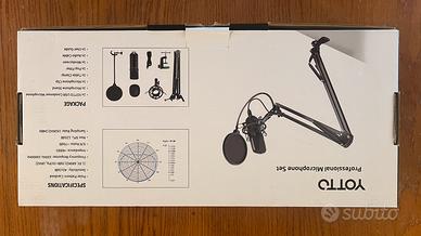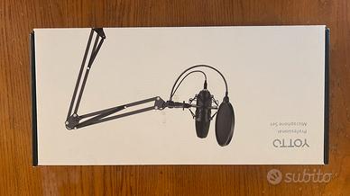 Set microfono YOTTO USB a condensatore con braccio snodato, shock mount, filtro antipop e copri‑spugna, tutto nella sua scatola originale come da foto: monti, colleghi al PC e sei subito pronto per streaming, videochiamate e registrazioni con audio pulito.