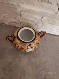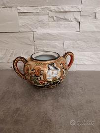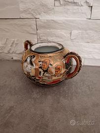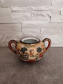 Vendo zuccheriera giapponese in ceramica con due manici, decorato a mano in stile Satsuma Moriage, con dettagli dorati in rilievo e figure tradizionali.
