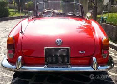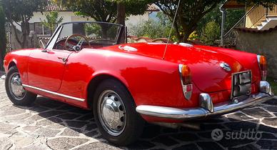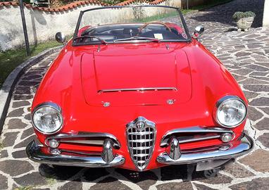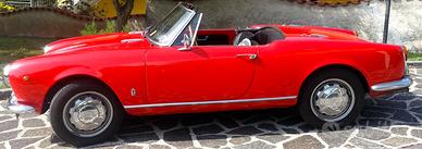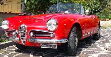 Alfa Romeo Giulia Spider del 1963, colore rosso con interni neri, autoradio Stereo8 dell'epoca, trombe bitonali.