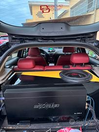 impianto audio composto da 4 25 GS audio 800w l’uno amplificati con un maxxaudio xx550.2, 2 trombe pgsound amplificate da un kenwood, un subwoofer dd 812d1 6.000w max amplificato da soundigital 5.000 evo4, stereo pioneer DEH-S310BT, cavo positivo 70mm collegamenti sia positivo che negativo fatti con cavo 50mm, barre di rame sia per positivo che per negativo, 3 batterie aggiuntive.