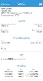Salve vendo stupenda Alfa Romeo 159 JTDm 150 Cv SW dai consumi bassissimi Anno 2007 con 160.000 Km..Gommata all’80% è appena Tagliandata con (Filtri , Olio e Frizione) Auto in buone condizioni generali e non necessita di alcun intervento..Motore è Meccanica in perfette condizioni..Interni senza alcun segno di usura..Modello Full Optional è dotata di 4 alza cristalli elettrici..chiusura centralizzata..clima automatico bi zona..servo sterzo..computer di bordo..specchietti elettrici..volante è sedili regolabili in altezza..stereo cd originale di serie con comandi multifunzionali al volante..sensori parcheggio sonori posteriori..sensori luce è pioggia..faretti fendinebbia..cerchi in lega ecc.. Disponibile a qualsiasi prova.. POSSIBILITÀ Di EVENTUALE FINANZIAMENTO SENZA ALCUN ANTICIPO PER L’INTERO IMPORTO.. Prezzo 3.900 €.. Se interessati chiamare al numero