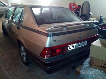 alfa romeo 75 1.6 carb\gpl, immatricolata 30\01\90 (modello 1989)con CRS(ASI+RIAR) tutta originale, auto in ordine colore bianco ghiaccio metallizzato(270) con interni in velluto grigio rombo belli, optional: cerchi in lega da 13", deflettori, indicatore olio motore, contachilometri tot+ parziali, l'auto è utilizzabile da subito, usata solo per raduni ,extra: montato stacca batteria + autoradio+ bracciolo anteriore + spoiler posteriore + bande adesivi laterali "alfa 75", a corredo i documenti di manutenzione effettuato negli anni. prezzo ruote classiche AB trattabile dopo visione.