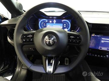 Sedili vinile e tessuto con reg. guidatore elettrica e massaggio a 6 vie e manuale passeggero, Alfa Connect Box Servizi Connessi Alfa Romeo: 10 anni Connect ONE & 3 anni Connect PLUS, Impianto Audio 6 altoparlanti Sistema, Infotainment con display da 10,25″ con navigazione, 2 porte USB, Bluetooth e comandi vocali, Quadro strumenti a cannocchiale da 12,3”, Alzacristalli elettrici anteriori/posteriori Piano baule regolabile a 3 livelli, Avviamento motore senza chiave, Poggiatesta posteriore, Bracciolo anteriore regolabile con vano, Portellone posteriore ad apertura e chiusura elettrica con funzione hands free, Climatizzatore automatico, Selettore modalità di guida, Fari anabbaglianti a LED, Specchietti retrovisori esterni regolabili elettricamente, Palette del cambio al volante, Body kit nero opaco con dettagli Rosso Brera e Scudetto frontale a V “Progresso”, Maniglie porte in tinta carrozzeria, Calotte specchietti retrovisori esterni nero lucido, Vetri posteriori oscurati, Fari posteriori a LED, Luci ambiente interne, Tasche schienale anteriori conducente/passeggero, Plafoniera anteriore e posteriore LED touch, Volante in pelle, Sedile posteriore abbattibile 60/40,Chiamata automatica d’emergenza, Lane centering e Traffic Jam Assist, Frenata automatica di emergenza con riconoscimento pedoni, Riconoscimento segnali stradali, Freno di stazionamento elettronico, Sensore pioggia per tergicristallo,Intelligent Adaptive Cruise Control, Sensori di parcheggio posteriori, Kit riparazione pneumatici Fix&Go, Telecamera posteriore con griglie dinamiche, Cerchi in lega da 18″ Fori, Pinze freno grigio anodizzate