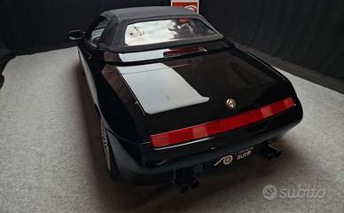 Alfa Romeo Spider serie limitata 3000cc 24V “L” anno 2001, Limited Edition , certificata ASI con C.R.S. auto ventennale che gode dell’esenzione bollo in alcune regioni d’Italia e della riduzione del 50% nella restante parte, e dell’assicurazione storica a circa 100 euro annuali, praticamente un 3000cc fantastico alla portata di chiunque. Una delle migliori vetture sportive anni ’90, alla guida ci diverte parecchio, ha un ottimo rapporto peso/potenza, lo sterzo è molto diretto e preciso, basta poco affinché tra lei ed il suo pilota si crei un ottimo feeling, facendolo sentire un tutt’uno con la strada. Le prestazioni sono più che decorose ed i consumi non esagerati. Comfort più che adeguato: bella linea, sedili anatomici ma soprattutto un rumore di fondo che indurrà a tenere spesso spento lo stereo. Insomma, l’ennesimo capolavoro firmato Alfa Romeo dall’ing. Busso. La versione di tre litri 24V, apprezzata e ricercata dai collezionisti proprio per il motore in grado di erogare 218 CV, è anche la più rara poiché costruita in 500 esemplari. La prima decappottabile tutta nuova dopo la “Duetto”, bella linea con tetto di tela a scomparsa totale ed elettrica solo su questa “limited edition”. La Spider 916 seppe convincere su strada, mostrando prestazioni valide e un’ottima tenuta, merito delle sospensioni, dell’avantreno a carreggiata larga e un retrotreno preciso. La linea, caratterizzata da un muso aggressivo con scudetto in rilievo e fari poliellissoidali, fianchi alti e avvolgenti, nervature sul cofano e profonde scalfature sulle fiancate, rendeva il complesso assai muscoloso. Il nuovo cambio a sei rapporti, il paraurti anteriore modificato ed una sottile cornice cromata allo scudetto caratterizzano esteticamente questo restyling che porta anche l’uniformità di colorazione della vettura. All’interno vi sono modifiche alla strumentazione, alle bocchette di aerazione ora rotonde, ai comandi; appare inoltre un nuovo volante in pelle a tre razze regolabile in altezza e p