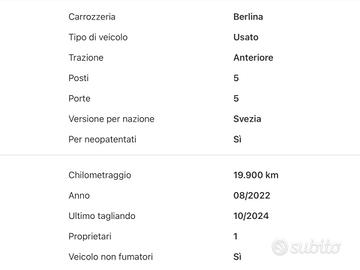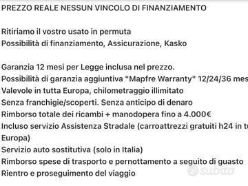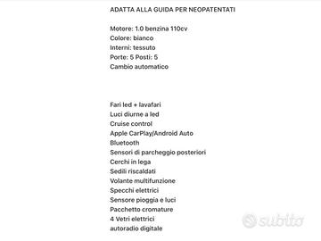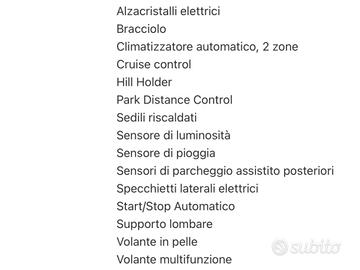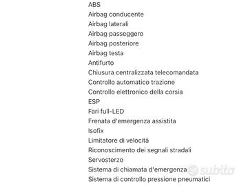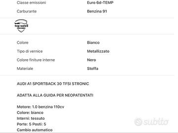 TOP SALES AUTOMOTIVE GROUP . VISITA NS SITO WEB TOPSALESAUTOMOTIVE.COM X NUOVE OFFERTE ( 200 AUTO DISPONIBILI ) VISITA NS SHOP AUTO SUBITO .IT X NUOVE OFFERTE ( 35 AUTO DISPONIBILI ) . TOP SALES AUTOMOTIVE GROUP . PROPONE . AUDI A1 BENZINA SPORTBACK 30 TFSI S TRONIC AUTOMATICA 110 CV . SI NEOPATENTATI . AUTO PARI AL NUOVO . NESUN INTERVENTO DA ESEGUIRE . TAGLIANDATA . TAGLIANDI CERTIFICATI FULL OPTIONAL .ALLEGATI DATI COMPLETI NB ( LEGGI TUTTO ). PER OGNI INFORMAZIONE E VISIONE GRADITO APPUNTAMENTO CONTATTARE ORARI UFFICI . O LASCIARE VS RECAPITO TELEFONICO O E-MAIL SARETE RICONTATTATI DA NS STAFF COMMERCIALE . SALUTI . TOP SALES AUTOMOTIVE GROUP . ABS Airbag laterali Antifurto Chiusura centralizzata Fendinebbia Pretensionatore cinture Airbag per la testa Fari anteriori allo xeno (a scarica di gas) Riconoscimento segnali stradali Monitoraggio angolo cieco Fari adattativi Riconoscimento pedone Isofix Chiusura centralizzata senza chiave Immobilizzatore elettronico Sistema di chiamata d'emergenza Sistema di riconoscimento della stanchezza Airbag guida Airbag passeggero Chiave con transponder Controllo elettronico della stabilità Immobilizzatore Controllo elettronico della trazione Airbag per le ginocchia Controllo automatico adattivo della velocità Fari anteriori a LED Avviso del cambio di corsia Frenata automatica di emergenza Airbag posteriore Controllo elettronico della corsia Luci diurne LED Sistema di controllo pressione pneumatici Sistema di visione notturna Luci diurne Appoggiatesta posteriori Climatizzatore Correttore assetto fari Lavatergifari Retrovisori elettrici termici Ricircolo aria Vetri elettrici anteriori Volante regolabile Interni in materiale pregiato Vernice metallizzata Sensore luci Hill Holder Controllo automatico clima Sospensioni pneumatiche Volante in pelle Cambio automatico Controllo automatico velocità Indicatore temperatura esterna Retrovisori