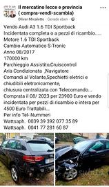 Vendo Audi A3 1.6 dti Sportback con cambio Automatico S-Tronic anno 2017 incidentata per intera incidentata o pure per pezzi di ricambio Motore 1.6 tdi , cambio Automatico S- Tronic,centraline, componenti eletronici,pezzi di carrozzeria,Volante con comandi eletronici,