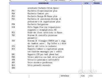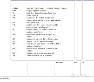 VETTURA PARI AL NUOVO,UFFICIALE AUDI ITALIANA,ANCORA IN GARANZIA CASA MADRE FINO AL 2029,GOMME NUOVE,SIGNORE DELLA NOSTRA ZONA,TRATTAMENTO NANO TECNOLOGIA DURATA 5 ANNI(SPESI 2000 EURO)ASPIRAZIONE VENTURI IN CARBONIO(SPESI 2500 E)SUPER ACCESSORIATA:AUDI PHONE BOX,CHIAVE COMFORT,APERTURA PORTELLONE POSTERIORE ELETTRICA,PACK LOOK NERO LUCIDO,DISPOSITIVO APERTURA GARAGE,FARI MATRIX,CALOTTE GUSCIO CARBONIO,IMPIANTO SCARICO SPORTIVO RS,CLIMA AUTOMATICO PLUS,APPLE CAR PLAY,PINZE FRENI ROSSE,PELLE NAPPA FINE CON STAMPIGLIATURA RS,SPOILER IN CARBONIO,TETTO APRIBILE,VETRI SCURI,IMPIANTO AUDIO SONOS,SOSPENSIONI ELETTRONICHE ADATTIVE,VOLANTE IN ALCANTARA Antifurto Chiusura centralizzata Riconoscimento segnali stradali Controllo automatico adattivo della velocità Avviso del cambio di corsia Frenata automatica di emergenza Appoggiatesta posteriori Climatizzatore Correttore assetto fari Lavatergifari Sedili regolabili elettricamente Vetri elettrici anteriori Volante regolabile Cambio automatico Controllo automatico velocità Servosterzo Tergilunotto Vetri elettrici posteriori Bracciolo sedili anteriori Radio DAB Connessione dati Cerchi in lega Sedile posteriore sdoppiato Veicolo non fumatori Parcheggio automatico Telecamera posteriore