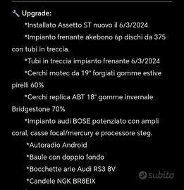 endo Audi A3 Sportback full optional anno 2009, con 235000km in ottime condizioni, numerosi lavori importanti già eseguiti, mappa installato downpipe e filtro sportivo, piastra bar-tek raffreddore olio cambio stronic maggiorato, cerchi da 19" omologati con pneumatici 235/3519. Lavori eseguiti: *Motore rifatto da officina autorizzata vw 185.000km *Sostituito testa nuova completa di alberi cams *Pompa alta pressione *Pompa dell'acqua *Pacco frizioni S tronic sostituito *meccatronica cambio sostituita NUOVA originale nel 12/24 con 216400km *sostituzione cuscinetti anteriori *sostituzione batteria 07/2025 *sostituzione nuovi fanali posteriori 01/2026 Auto perfettamente funzionante, la maggior parte dei lavori sono stati effettuati a 185.000km quanto è stato rifatto il motore. Allestimento e optional: *Tettuccio apribile *pacchetto line interno nero *pacchetto sline esterno *Sedili in pelle elettrici e riscaldati *Impianto audio Bose *Sensori parcheggio anteriori e posteriori *Retrofit Retrocamera *volante sportivo multifunzione castomizzato *Triangoli e freno a mano castomizzato pelle cucitura rossa. *Retrofit Clima automatico bizona Audi Q3 *Illuminazione ambiente interna piede e maniglia *Cruise control *Fari Bi-xenon con predisposizione AFS *Sensore luce/pioggia *Specchietto fotocromatico con bussola *Vetri posteriori privacy, anteriori leggermente oscurati. *specchietti retrovisore S3 elettrici e riscaldati predisposizione fotocromatico. *pulsante set pressione * sostituzione Supporti ammortizzatore. *Airbag, sui montanti sedili anteriore e posteriori. *pacchetto porta oggetti Auto sempre mantenuta con cura, tagliandata personalmente da appassionato con ricambi top. ideale per chi cerca una A3 8P da appassionato, vendo per cambio tipologia di macchina. Contattare solo se realmente interessati, no perditempo primo contatto tramite Email..!