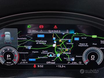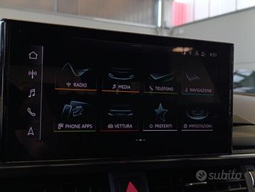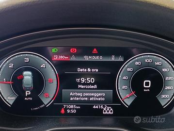 LISTA ACCESSORI : aggiornamento modello airbag lat. ant. airbag lato passeggero disinseribile aiuto parcheggio ant. e post., acustico e ottico con indicazione selettiva (APS Plus) Allestimento int.: inserti decorativi cruscotto inil plancia cruscotto Nero opaco Allestimento int.: inserti decorativi Vernice diamantata grigio argento alloggiamenti Isofixper sedile bambini assetto standard Audi connect (Sistema assistenza e emergenza) Audi Drive Select Audi Smartphone Interface bracciolo ctr. ant. allestimento Comfort cambio 7 marce - cambio doppia frizione S-tronic cerchi in lega 7,5x17 (5 razze, Dynamik) climatizzatore automatico comfort 3 zone codice radio corrimano tetto (alluminio) cristalli atermici atermico verde elettron. controllo stabilità (ESC) filtro antiparticolato Fodere sedili/rivestimenti: Tessuto Index fondo carico multiuso (fondo carico) immobilizzatore (elettronico) impianto limitatore velocità impianto regolazione velocità (Tempomat) interfaccia multi-media MMI basic Plus / MMI radio Plus Audi music interface interfaccia multi-media MMI Navigation Plus con MMI Touch Audi connect (servizi internet), sistema informazione conducente (FIS) con display a colori interfaccia universale Bluetooth kit riparazione pneumatici lampeggiatori led in retrovisore est. integrato luce guida diurna led Mild-Hybrid 120 kW (motore 2,0 Ltr. - 120 kW 16V TDI) Mild-Hybrid-Technologie Modanature finestrino Nero modanature sottoporta con inserti alluminio pacchetto di assistenza Tour Sistema assistenza guida: assistente abbaglianti, Sistema assistenza guida: Riconoscimento segnaletica stradale, Sistema assistenza guida: Funzione freno di emergenza city (Audi pre sense City), Sistema assistenza guida: Assistente coda, Sistema assistenza guida: Assistente manovra, Sistema assistenza guida: Assistente alla svolta sx, Sistema assistenza guida: Regolazione distanza automatica (