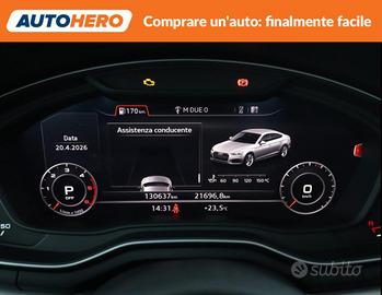 Chilometraggio: 130637 Condizioni: usato Immatricolazione: 07/2019 Tipologia: 4/5-Porte Carburante: Diesel Tipo di cambio: Automatico ABS, Airbag, Airbag laterali, Airbag Passeggero, Airbag testa, Alzacristalli elettrici, Autoradio, Bluetooth, Boardcomputer, Bracciolo, Cerchi in lega, Chiusura centralizzata, Climatizzatore automatico, 2 zone, Controllo elettronico della corsia, Controllo trazione, Controllo vocale, Cruise Control, ESP, Fari LED, Filtro antiparticolato, Freno di stazionamento elettrico, Immobilizzatore elettronico, Isofix, Leve al volante, Luci diurne, Luci diurne LED, MP3, Portellone posteriore elettrico, Schermo multifunzione interamente digitale, Sedile posteriore sdoppiato, Sensore di luce, Sensore di pioggia, Sensori di parcheggio anteriori, Sensori di parcheggio posteriori, Servosterzo, Sistema di navigazione, Sound system, Specchietti laterali elettrici, Start/Stop Automatico, Touch screen, USB, Vivavoce, Volante in pelle, Volante multifunzione PAGAMENTO ALLA CONSEGNA, RESO GRATUITO E 1 ANNO DI GARANZIA: SOLO SU AUTOHERO! _________________________________________ SEMPRE INCLUSO: - Pagamento alla consegna, prima vedi poi paghi - Reso gratuito, avrai 21 giorni e 500 km per cambiare idea - Finanziamento flessibile**, personalizzabile senza vincoli - Standard di qualità, veicoli ricondizionati e sanificati - Semplicità nell'acquisto, gestiamo noi tutte le pratiche - Acquisto sicuro, più di 1000 feedback positivi su Trustpilot - Garanzia 12 mesi inclusa, estendibile fino a 36 mesi _________________________________________ SALIAMO A BORDO! Tra le nostre Audi A5 Sportback, questa si presenta nell allestimento Sport che valorizza l'anima sportiva della vettura con linee dinamiche e interni studiati per non farti mai stancare. Immatricolata a luglio 2019, si presenta in buone condizioni. L alimentazione Diesel è ancora la soluzione migliore per gli spostamenti più lunghi e per garantire maggiore vita al tuo motore, grazie a