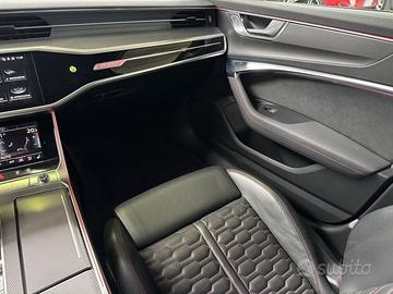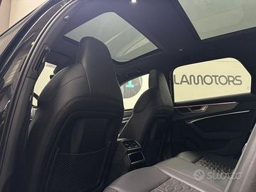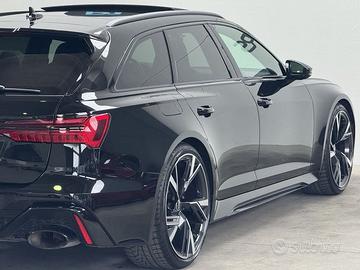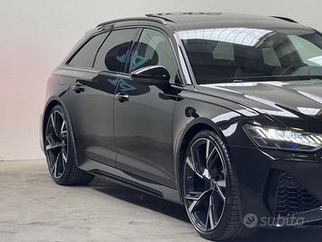 Audi RS6 Avant 4.0 V8 TFSI, Nera metallizzata con interni in pelle Nappa nera e cuciture rosse, tetto panoramico apribile in vetro, cerchi in lega Audi Rs da 22 pollici neri e diamantati, vetri oscurati, pacchetto Audi Black completo, gancio traino estraibile elettricamente, sedili elettrici, clima quadri zona, sospensioni regolabili elettricamente, volante e sedili riscaldati, impianto audio Bang & Olufsen, fari Full Led Matrix.