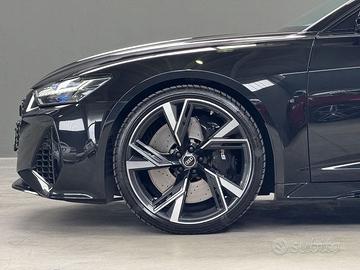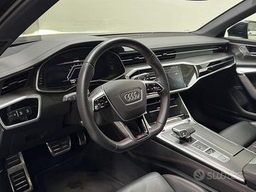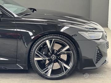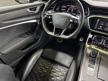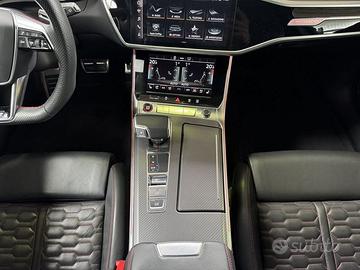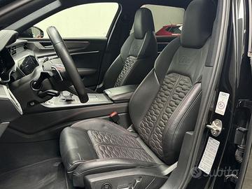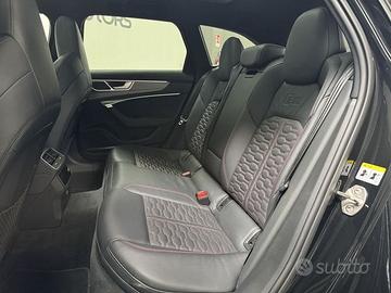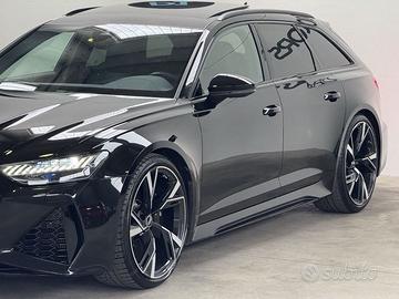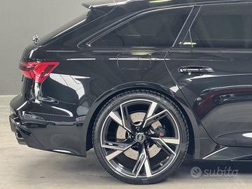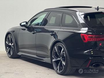 Audi RS6 Avant 4.0 V8 TFSI, Nera metallizzata con interni in pelle Nappa nera e cuciture rosse, tetto panoramico apribile in vetro, cerchi in lega Audi Rs da 22 pollici neri e diamantati, vetri oscurati, pacchetto Audi Black completo, gancio traino estraibile elettricamente, sedili elettrici, clima quadri zona, sospensioni regolabili elettricamente, volante e sedili riscaldati, impianto audio Bang & Olufsen, fari Full Led Matrix.