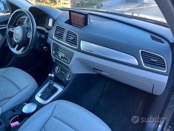 AUDI Q3 2.0TDI 177cv QUATTRO (trazione integrale) allestimento SPORT con cambio automatico 7 rapporti, navigatore cartografico, Bluetooth, radio cd mp3 con ingresso USB e AUX, climatizzatore elettronico tre zone, interni sportivi in pelle totale di colore grigio chiaro, volante sportivo in pelle multifunzione con comandi del cambio (cambio F1), cruise control, sensori parcheggio anteriori e posteriori, specchi retrovisori regolabili e richiudibili elettronicamente, fari BI-XENON, cerchi in lega da 17" con gomme quattro stagioni al 80%, sensore luce e pioggia, vetri privacy..