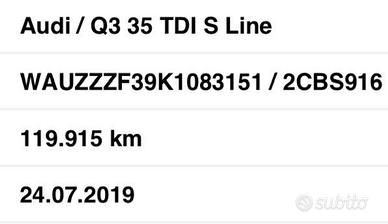 AUTO TENUTA CON CURA - UN SOLO PROPRIETARIO ULTIMA FOTO ( una parte della fattura d'acquisto ) : ALLESTIMENTO- TELAIO - TARGA ESTERA ( BELGIO ) - KM - ANNO D'IMMATRICOLAZIONE AUDI Q3 35 TDI SLINE cc2.0TDI 16V 150CV , LUGLIO 2019 , EURO 6d-TEMP , con 119921 km , Cambio 7 marce , a doppia frizione STRONIC SLINE : CERCHI IN LEGA DA 20 POLLICI BICOLORE DIAMANTATI - VETRI PRIVACY - PORTELLONE ELETTRONICO - INTERNI IN PELLE TOTALE NERA - SENSORE DI CORSIA - CRUISE CONTROL ADATTIVO - SENSORI DI PARCHEGGIO ANTERIORI E POSTERIORI - SPECCHIETTI RICHIUDIBILI ELETTRONICAMENTE - QUADRO STRUMENTI DIGITALE ( AUDI VIRTUAL COCKPIT ) BATTERIA NUOVA MESSA il 02/10/2025 DUE CHIAVI CON TELECOMANDO Ottime condizioni generali interne, esterne e meccaniche Garanzia e possibilita' di finanziamenti agevolati. SI VALUTANO PERMUTE L'auto è disponibile a Sommatino ( CL ) in viale Fontaine 10 ( vicino la caserma dei carabinieri ) per qualsiasi vostra prova e controllo con meccanico di vostra fiducia . Non esitate a contattarmi per qualsiasi altra informazione alla mia email o direttamente al mio cellulare anche whatsapp PREZZO IN PROMOZIONE : 24500 euro - 1 ANNO DI GARANZIA CONFORMGEST SPA ( COMPLETA ) ESCLUSA ( 400 euro ) PASSAGGIO DI PROPRIETA' ESCLUSO ( 750 euro )