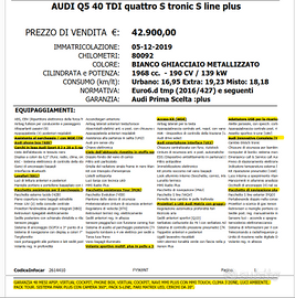 Vendo AUDI Q5 40 TDI quattro S tronic S line plus immatricolata a dicembre 2019. Auto acquistata ad aprile 2023 con la formula audi prima scelta plus e ancora in GARANZIA UFFICIALE AUDI FINO A APRILE 2027. Auto tutta tagliandata presso la concessionaria AUDI di Martina Franca