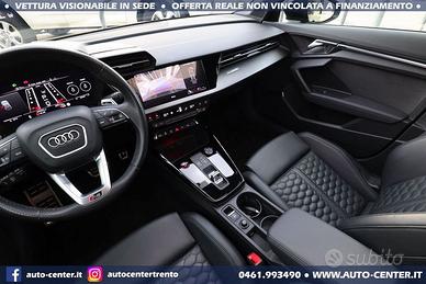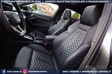 DEK:[10908475] DIAMO PRECEDENZA ALLE RICHIESTE COMPLETE DI RECAPITO TELEFONICO Siamo organizzati per trattativa ed acquisto A DISTANZA, con anche spedizione via camion a domicilio. Ci potete contattare compilando l'apposito modulo, via mail, whatsapp, oppure telefonicamente: -- SALONE VENDITE -- SIMONE -- LUCA -- SUL NOSTRO SITO AUTO-CENTER.IT POTETE VISUALIZZARE + DI 60 FOTO PER OGNI AUTO DESCRIZIONE Usato ritirato da ns cliente in OTTIME condizioni con chilometraggio certificato. Cronologia Service AUDI: 04/2022 con 5.041 km 03/2023 con 16.383 km 12/2023 con 20.849 km 01/2025 con 31.771 km 12/2025 con 41.814 km IVA NON DEDUCIBILE POSSIBILITA' FINANZIAMENTO • Riferimento RS3-013 • Prima immatricolazione 01/2022 • Chilometraggio 44.500 KM CERTIFICATI • Garanzia Audi fino a 01/2027 + integrazione nostra fino a 12 MESI • Passaggio / IPT non compreso nel prezzo • Valutiamo permute anche di valore superiore (se di nostro interesse) • NON ritiriamo Moto e Auto d’epoca; NON accettiamo offerte al ribasso • PRONTA CONSEGNA IN SEDE A TRENTO • Visionabile da Lunedì a Sabato (Sabato aperti dalle 9.00 alle 13.00) • È gradito l’APPUNTAMENTO AUDI RS3 SPORTBACK 2.5 TFSI QUATTRO STRONIC 400CV EURO6 COLORE ESTERNO Grigio Daytona perla INTERNI Pelle Nera ALLESTIMENTO INCLUSO • 5 porte • 5 posti • Accendisigari e posacenere anteriore rimuovibile • Adaptive cruise assist con Emergency Assist • Adaptive speed assist (ACC) • Assistenza alla frenata di emergenza • Audi Extended Warranty: 3 anni (scadenza 01/2027), fino a 100.000 km • Audi Smartphone Interface • Audi connect Navigation & Infotainment plus • Audi connect key • Audi phone box • Bang & Olufsen 3D Premium Sound