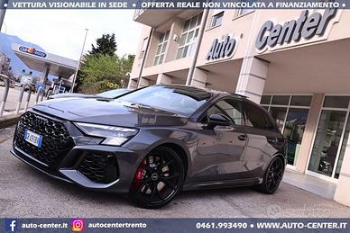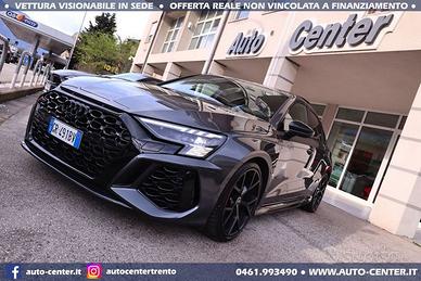 DEK:[1000016033] DIAMO PRECEDENZA ALLE RICHIESTE COMPLETE DI RECAPITO TELEFONICO Siamo organizzati per trattativa ed acquisto A DISTANZA, con anche spedizione via camion a domicilio. Ci potete contattare compilando l'apposito modulo, via mail, whatsapp, oppure telefonicamente: -- SALONE VENDITE -- SIMONE -- LUCA -- SUL NOSTRO SITO AUTO-CENTER.IT POTETE VISUALIZZARE + DI 60 FOTO PER OGNI AUTO DESCRIZIONE Usato ritirato da ns cliente in OTTIME condizioni con chilometraggio certificato. Cronologia Service AUDI: 04/2022 con 5.041 km 03/2023 con 16.383 km 12/2023 con 20.849 km 01/2025 con 31.771 km 12/2025 con 41.814 km IVA NON DEDUCIBILE POSSIBILITA' FINANZIAMENTO • Riferimento RS3-013 • Prima immatricolazione 01/2022 • Chilometraggio 44.500 KM CERTIFICATI • Garanzia Audi fino a 01/2027 + integrazione nostra fino a 12 MESI • Passaggio / IPT non compreso nel prezzo • Valutiamo permute anche di valore superiore (se di nostro interesse) • NON ritiriamo Moto e Auto d’epoca; NON accettiamo offerte al ribasso • PRONTA CONSEGNA IN SEDE A TRENTO • Visionabile da Lunedì a Sabato (Sabato aperti dalle 9.00 alle 13.00) • È gradito l’APPUNTAMENTO AUDI RS3 SPORTBACK 2.5 TFSI QUATTRO STRONIC 400CV EURO6 COLORE ESTERNO Grigio Daytona perla INTERNI Pelle Nera ALLESTIMENTO INCLUSO • 5 porte • 5 posti • Accendisigari e posacenere anteriore rimuovibile • Adaptive cruise assist con Emergency Assist • Adaptive speed assist (ACC) • Assistenza alla frenata di emergenza • Audi Extended Warranty: 3 anni (scadenza 01/2027), fino a 100.000 km • Audi Smartphone Interface • Audi connect Navigation & Infotainment plus • Audi connect key • Audi phone box • Bang & Olufsen 3D Premium Sound