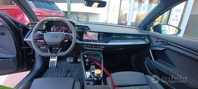 AUDI RS3 STRONIC SUPER ACCESSORIATA DEL MARZO 2025 CON POCHISSIMI CHILOMETRI. monta sensori parcheggio anteriori e posteriori, retrocamera, navigatore, clima bizona, fari Matrix, cockpit digitale, tetto panoramico, interni in pelle nappa con cuciture verdi, volante appiattito in Alcantara , impianto Audio Sonos e tantissimi altri optional. Prezzo di listino era di 86 Mila euro. Chilometri certificati, mai incidentata. Prezzo trattabile.