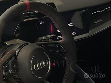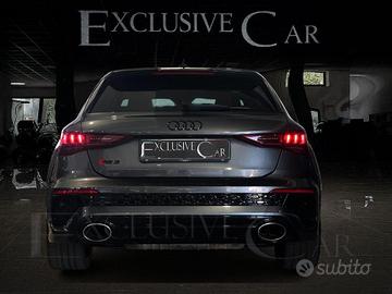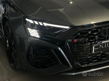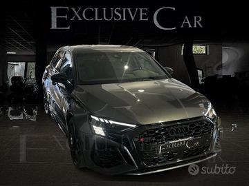 Audi RS3 Sportback (8YS) 2.5 TFSI quattro 400 CV in Grigio Daytona perlato, il connubio perfetto tra potenza e design. Motore 2.5 litri 5 cilindri da 294 kW (400 CV) con trazione integrale quattro e cambio S tronic. Interni Soul/rosso Express, plancia e padiglione neri, sedili RS in pelle, cerchi neri Audi Sport, freni carboceramici e fari LED Matrix.