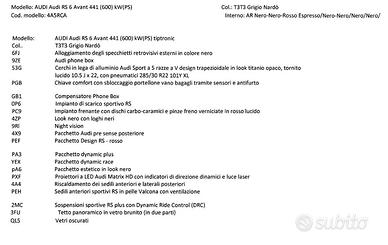 Ciao, sono Giorgio di PGautomotive.it ho ispezionato e provato quest'auto. Tutte le informazioni che leggi nella scheda del veicolo sono state da me verificate personalmente. Per qualsiasi altra informazione o per un test drive puoi scrivermi su WhatsApp oppure contattami al - VISIBILE SOLO SU APPUNTAMENTO - Poche auto sanno coniugare prestazioni da supercar e usabilità come la wagon l’Audi RS 6 Avant , che è un “missile” da autobahn che monta un V8 da 600 CV. Questa che vi proponiamo è uno stupendo esemplare, tenuto in modo maniacale e con pochissimi chilometri percorsi; auto ufficiale Audi italia, unico proprietario non fumatore, tagliandi ufficiali Audi, mai in pista, super accessoriata, cerchi originali nuovi perchè sostituiti da quelli in foto, Riepilogo optional (nell’ultima foto) : - COLORE GREY NARDO’ - ALLOGGIAMENTO SPECCHI NERI € 130,00 - AUDI PHONE BOX € 590,00 - CERCHI IN LEGA LOOK TITANIO OPACO 22" € 2.800,00 - CHIAVE COMFORT CON SBLOCCAGGIO PORTELLONE BAGAGLI TRAMITE SENSORI E ANTIFURTO € 1.000,00 - LOOK NERO CON LOGHI NERI € 450,00 - PACCHETO AUDI PRE SENS POSTERIORE € 850,00 - PACCHETTO ESTETICO LOOK NERO € 800,00 - SEDILI RISCALDATI ANTERIORI E POSTERIORI € 460,00 - SEDILI ANTERIORI SPORTIVI RS IN PELLE VALCONA VENTILATI - TETTO PANORAMICO APRIBILE IN VETRO BRUNITO € 2.300,00 - VETRI ISOLATI E OSCURATI € 550,00 - PROIETTORI LED AUDI MATRIX HD CON INDICATORI DI DIREZIONE DINAMICI A LUCE LASER - PINZE FRENO VERNICIATE IN ROSSO LUCIDO € 610,00 - NIGHT VISION : telecamera a infrarossi con visualizzazione immagini attraverso il display conducente, visione fino a 800 metri, con avvisi al conducente evidenziando persone e animali, quando rileva un ostacolo il colore può cambiare da giallo a rosso e viene emesso un segnale acustico. (Di grandissimo aiuto per guida notturna soprattutto con nebbia fitta o neve si può guidare unicamente guardando lo schermo con tutti i sistemi adas attivi). € 2.500,00 - PACCHET