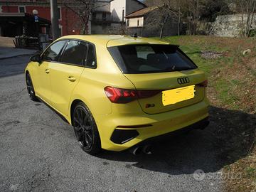 Vendo Audi S3 Sportback 2.0 tfsi Sport Attitude quattro s-tronic. Vettura perfetta, ancora in garanzia Audi, giallo pitone metallizzato, cielo ed interni alcantara neri, fari led matrix, pacchetto nero, tetto panoramico in vetro, telaio S, assetto sportivo regolabile, 8 cerchi in lega neri audi, 4 da 19" con Pirelli p zero da asciutto, 4 da 18" con Pirelli sottozero invernali, scarico sportivo Ragazzon con card di omologazione(più scarico originale intonso, imballato), ruotino di scorta, impianto stereo Bang e Olufsen. Vendo per arrivo anticipato della nuova vettura.