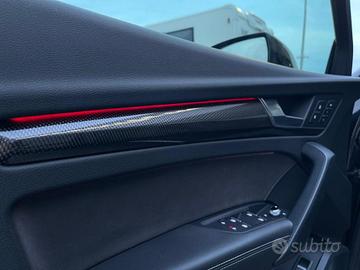 SQ5 sportback CARBON PACK, vettura a trazione integrale equipaggiata con fari O-led Matrix adattivi, pack night, cerchi in lega Audisport RS da 22", ulteriore set di 4 cerchi da 20" con gomme invernali, pinze rosse, sospensioni pneumatiche regolabili, scarico con sound adattivo regolabile, fari di profondità antiabbagliamento, telecamera 360°, sensori di parcheggio anteriori e posteriori, vetri posteriori oscurati con tendina, frenata anticollisione, fendinebbia, portellone posteriore elettronico, tetto panoramico e apribile, sedili in pelle massaggianti, riscaldabili sia anteriori che posteriori con memoria delle posizioni e regolabili elettronicamente, climatizzatore automatico 3 zone, impianto stereo Bang & Olufsen, sensori luci e pioggia, volante multifunzione tagliato in alcantara, Bluetooth, vivavoce, adaptive cruise control, virtual cockpit, keyless go, keyless-entry, drive select, doppia presa usb, head-up display, schermo multifunzione interamente digitale, navigatore satellitare, Apple carplay e Android auto, regolazione della velocità in discesa, finiture in carbonio sulla plancia e sugli sportelli, ricarica wireless, gancio traino elettronico a scomparsa Audi, ecc ecc..