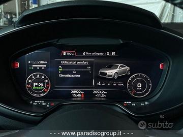 Airbag fullsize - Airbag laterali anteriori - Airbag laterali anteriori e sistema di airbag per la testa - Alloggiamento degli specchietti retrovisivi esterni in colore carrozzeria - Appoggiabraccia centrale anteriore - Assetto con taratura sportiva - Audi drive select - Audi music interface - Audi single frame - Audi virtual cockpit - Cerchi in lega d'alluminio fucinato 8J x 17 con design a 5 razze, con Pneumatici 225/50 R17 94W - Chiusura centralizzata - Cielo dell'abitacolo in tessuto nero - Climatizzatore manuale - Controllo elettronico della stabilità (ESC) - Dispositivo antislittamento in partenza (EDS) - Dispositivo di assistenza alla frenata per collisione secondaria - Dispositivo di controllo della trazione (ASR) - Dispositivo elettronico antiavviamento (immobilizer) - Elementi colorati negli interni in vernice tattile nera - Filtro antiparticolato per motori Benzina - Freno di stazionamento elettromeccanico - Gruppi ottici posteriori a LED - Impianto frenante - Inserti in vernice grigio metallizzato -