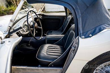 Austin Healey 100, poi conosciuta come 100/4, che vi presentiamo è una BN1, prima serie, con cambio 3 marce, in colore Old English White, con interni e capotte in pelle blu.