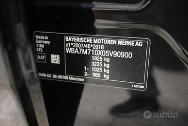 Accensionesenza inserimento chiave con tasto Start & Stop - ABS - Airbag anterioriper guidatore e passeggero - Airbag laterali - Airbag per la testa - Poggiatestaposteriori - Autoradio con display touch screen 10”, ingresso usb e comandi alvolante - Vivavoce Bluetooth con funzione streaming audio - Bracciolo sediliposteriori con presa di ricarica device - Battitacco anteriori in alluminio conlogo BMW - Cambio manuale a 6 rapporti - Cerchi in lega da 16" - Chiavecon transponder - Chiusura centralizzata - Climatizzatore automatico bizona -Controllo automatico velocità - Controllo elettronico della stabilità -Controllo elettronico della trazione - Connected Drive - Correttore assettofari - Driving Assistant (sistema di sicurezza attiva anticollisione) e laneassist - Avviso cambio corsia - Dispositivo accensione automatica fari esensore pioggia [521] - Filtro anti particolato - Fari anteriori e luci diurnea led - Immobilizzatore - Indicatore temperatura esterna - Illuminazioneabitacolo led - Pretensionatore cinture - Retrovisori regolabili e riscaldabilielettricamente con indicatori di direzione integrati - Sedili anterioriregolabili - Sedile guida regolabile in altezza - Sedile posteriore sdoppiato -Sensori di parcheggio anteriori e posteriori - Specchietto retrovisore internofotocromatico - Modalità di guida COMFORT/SPORT/ECO PRO - Servosterzo - Start&stop- Tergilunotto - Vetri elettrici anteriori - Vetri elettrici posteriori -Volante in pelle regolabile in altezza e profondità - Navigatore satellitare -Proiezione multimediale da smartphone Apple CarPlay e Android Auto - Bmwdigital cockpit - Serbatoio aggiuntivo per adblue - Kit fix&go.