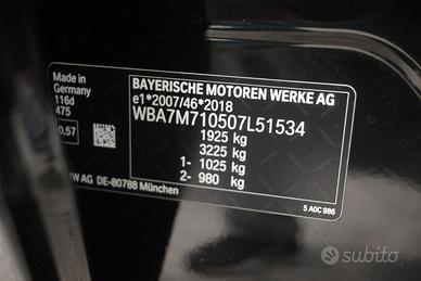 Accensionesenza inserimento chiave con tasto Start & Stop - ABS - Airbag anterioriper guidatore e passeggero - Airbag laterali - Airbag per la testa - Poggiatestaposteriori - Autoradio con display touch screen 10”, ingresso usb e comandi alvolante - Vivavoce Bluetooth con funzione streaming audio - Bracciolo sediliposteriori con presa di ricarica device - Battitacco anteriori in alluminio conlogo BMW - Cambio manuale a 6 rapporti - Cerchi in lega da 16" - Chiavecon transponder - Chiusura centralizzata - Climatizzatore automatico -Controllo automatico velocità - Controllo elettronico della stabilità -Controllo elettronico della trazione - Connected Drive - Correttore assettofari - Driving Assistant (sistema di sicurezza attiva anticollisione) e laneassist - Avviso cambio corsia - Dispositivo accensione automatica fari esensore pioggia [521] - Filtro anti particolato - Fari anteriori e luci diurnea led - Immobilizzatore - Indicatore temperatura esterna - Illuminazioneabitacolo led - Pretensionatore cinture - Retrovisori regolabili e riscaldabilielettricamente con indicatori di direzione integrati - Sedili anterioriregolabili - Sedile guida regolabile in altezza - Sedile posteriore sdoppiato -Sensori di parcheggio anteriori e posteriori - Modalità di guidaCOMFORT/SPORT/ECO PRO - Servosterzo - Start&stop - Tergilunotto - Vetrielettrici anteriori - Vetri elettrici posteriori - Volante in pelle regolabilein altezza e profondità - Navigatore satellitare - Proiezione multimediale dasmartphone Apple CarPlay e Android Auto - Bmw digital cockpit - Serbatoioaggiuntivo per adblue - Kit fix&go.