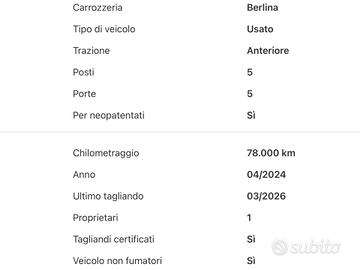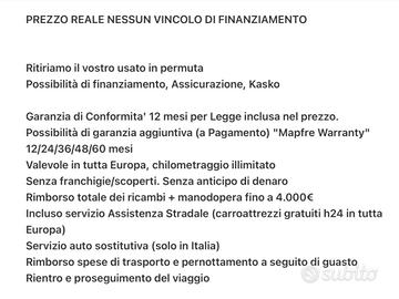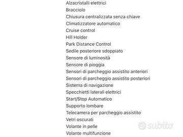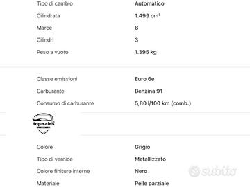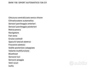 TOP SALES AUTOMOTIVE GROUP . VISITA NS SITO WEB TOPSALESAUTOMOTIVE.COM X NUOVE OFFERTE ( 150 AUTO DISPONIBILI ) VISITA NS SHOP AUTO SUBITO .IT X NUOVE OFFERTE ( 35 AUTO DISPONIBILI ) . BMW 118i SPORT 1.5 5 PORTE 136 CV . SW PERFETTA . NESUN INTERVENTO DA ESEGUIRE . TAGLIANDATA . TAGLIANDI CERTIFICATI . FULL OPTIONAL . ALLEGATO DATI COMPLETI . NB ( LEGGI TUTTO ) . PER OGNI INFORMAZIONE E VISIONE GRADITO APPUNTAMENTO CONTATTARE ORARI UFFICI . O LASCIARE VS RECAPITO TELEFONICO O E-MAIL SARETE RICONTATTATI DA NS STAFF COMMERCIALE . SALUTI . TOP SALES AUTOMOTIVE GROUP . ABS Airbag laterali Antifurto Chiusura centralizzata Fendinebbia Pretensionatore cinture Airbag per la testa Fari anteriori allo xeno (a scarica di gas) Riconoscimento segnali stradali Monitoraggio angolo cieco Fari adattativi Riconoscimento pedone Isofix Chiusura centralizzata senza chiave Immobilizzatore elettronico Sistema di chiamata d'emergenza Sistema di riconoscimento della stanchezza Airbag guida Airbag passeggero Chiave con transponder Controllo elettronico della stabilità Immobilizzatore Controllo elettronico della trazione Airbag per le ginocchia Controllo automatico adattivo della velocità Fari anteriori a LED Avviso del cambio di corsia Frenata automatica di emergenza Airbag posteriore Controllo elettronico della corsia Luci diurne LED Sistema di controllo pressione pneumatici Sistema di visione notturna Luci diurne Appoggiatesta posteriori Climatizzatore Correttore assetto fari Lavatergifari Retrovisori elettrici termici Ricircolo aria Sedili regolabili elettricamente Sospensioni autoregolabili Vetri elettrici anteriori Volante regolabile Interni in materiale pregiato Vernice metallizzata Sensore luci Hill Holder Controllo automatico clima Sedili ventilati Sospensioni pneumatiche Volante in pelle Leve al volante Cambio automatico Controllo automatico velocità Indicatore temperatura esterna