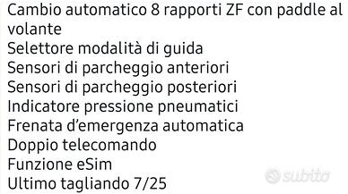 Auto perfetta in tutto e per tutto, pari al nuovo, tenuta maniacalmente, sempre tagliandata regolarmente in concessionaria ufficiale e ancora in garanzia BMW fino a novembre 2026. Trazione integrale. Full optional ed equipaggiata con gomme estive con cerchi in lega da 19" (a parte anche set di gomme invernali con cerchi in lega da 18"), navigatore, retrocamera 360° anche su specchietti, sensori laterali, anteriori e posteriori, controllo guida autonoma con assistenza alla guida, riconoscimento di corsia e frenata d'emergenza, parcheggio automatico, clima automatico 4 zona, keyless, start and stop, cruise control adattivo, ottimo impianto audio con schermo touch digitale, bluetooth, fari led direzionali, luci ambient light, impianto frenante maggiorato Msport con pinze rosse. No fumatori. Tenuta sempre in garage. Possibilità di finanziamento e/o subentro finanziamento attuale.
