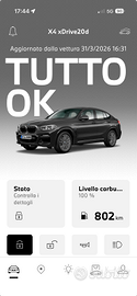 Vettura acquistata nuova a Giugno 2020 presso concessionario ufficiale BMW Italia della Sicilia. Unico proprietario, non fumatore. Disponibili le doppie chiavi. É presente in auto il libretto tagliandi digitale con la cronologia interventi service regolarmente effettuati c/o il Service del mio Concessionario BMW fiducia. Vettura realmente in eccellente stato d'uso. Eccellenti condizioni interne. Esternamente da rivedere in piccolissimi dettagli, cerchi in perfetto ordine. Tutta originale, vernice originale. Fatturabile (parzialmente). Attualmente monta gomme termiche Pirelli Winter Sottozero 3 RunFlat al 70%. Sophisto Grey metallizzato Cerchi in lega leggera M da 19", styling a doppi raggi n° 698 M Pelle Vernasca Oyster con profili in contrasto Grey Questi gli accessori più significativi: Fari full LED adattivi Parking Assistant Plus Driving Assistant Plus Regolaz. elettrica sedili anteriori con funzione Memory per sedile di guida Sedili anteriori riscaldabili Tetto panoramico in vetro Antifurto con telecomando Comfort Access System Sistema Wireless Charging di ricarica per il cellulare iDrive7.0 con Virtual Cockpit BMW Head-Up Display Sistema di altoparlanti HIFI Surround Harman/Kardon X4 G02 20d xdrive