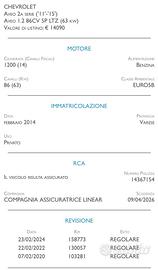 Vendesi Chevrolet Aveo del 2014. Si consegna tagliandata e revisionata. GARANZIA 12 MESI MOTORE/CAMBIO - UNICO PROPRIETARIO - IMPORTO FINANZIABILE - CARATTERISTICHE: Anno Imm. 02/2014 Carburante Benzina Potenza 63KW (86CV) Cambio Benzina Chilometraggio 184’000 Scocca Berlina, 5 porte Tipo di dotazione 1.2 86CV 5 porte LTZ Consumo carburante 5.5l/100 km Categoria di emissione Euro 5B Colore Nero Condizioni/Manutenzione Veicolo non incidentato, in buone condizioni NEOPATENTATI SI Revisione Da effettuare prima della consegna Passaggio di proprietà € 550,00 (escluso dal prezzo di vendita) Dotazione ABS,Airbag, Alzacristalli elettrici, Aria condizionata, CD, Chiusura centralizzata, MP3, Radio, Servosterzo, Bluetooth, Computer di bordo, Comandi al volante, Cruise control