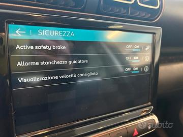 ACCESSORI: cerchi in lega 17'' ORIGAMI diamantati, spoyler post.re, vetri post.ri oscurati, mancorrenti longit. al tetto Black, fari fendinebbia con funz. di cornering, luci diurne e proiettori direzionali a led, rilevatore ostacoli post.re, retrovisori est. regolab. e ripiegab. elettr., climatizzatore automatico, modulo mp3 usb, display Touch Pad 9'' (con radio DAB, sistema di navigaz. satellitare Citroen Connect Nav, Mirror screen e telecam. post.re 180), sensore luci e pioggia, volante in pelle multif., cruise control (regolat. e limit. velocità), airbags, abs afu ref, esp, hill assist, Active Safety Brake, Lane Keeping Assist, Driver Alert, Speed Limit Detect., keyless system, 4 vetri elettr., sedili in tessuto Mica Grey.