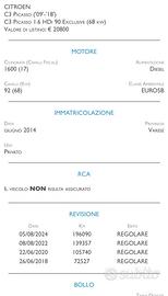 Vendesi Citroen C3 Picasso del 2014. Si consegna tagliandata e revisionata. GARANZIA 12 MESI MOTORE CAMBIO - UNICO PROPRIETARIO - IDEALE PER NEOPATENTATI - CARATTERISTICHE: Anno Imm. 06/2014 Carburante Diesel Potenza 68KW (92CV) Cambio Automatico Chilometraggio 8223’000 Scocca Monovolume, 5 Porte Tipo di dotazione 1.6 e-HDi 90 Exclusive Consumo carburante 4.3l/100 km Categoria di emissione Euro 5B Colore Argento Condizioni/Manutenzione In buone condizioni NEOPATENTATI SI Revisione 08/2026 Costo passaggio (non incluso) € 500,00 Dotazione ABS, Airbag passeggero, Alzacristalli elettrici, Antifurto, Chiusura centralizzata, Radio, Servosterzo, Aria condizionata, ESP, Computer di bordo