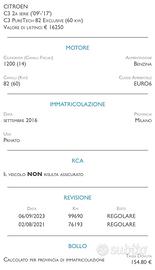 Vendesi Citroen C3 1.2 Benzina del 2016. Si consegna tagliandata. UNICO PROPRIETARIOIDEALE PER NEOPATENTATI GARANZIA 12 MESI CERTIFICATA FINANZIABILE CARATTERISTICHE: Anno Imm. 09/2016 Carburante Benzina Potenza 60KW (82CV) Cambio Manuale Chilometraggio 119’000 Scocca Berlina, 5 Porte Tipo di dotazione 1.2 C3 PureTech 82 Monna Lisa Consumo carburante 4.7l/100 km Categoria di emissione Euro 6 Colore Bianca Condizioni/Manutenzione In buone condizioni NEOPATENTATI SI Revisione Da effettuare prima della consegna Costo passaggio (non incluso) € 500,00 Dotazione ABS, Airbag passeggero, Airbag laterali, Alzacristalli elettrici, Antifurto, Aria condizionata, Chiusura centralizzata, Chiusura centralizzata con telecomando, Radio, Servosterzo, Vetri elettrici anteriori, Bluetooth, Telecamera post., Sensori parcheggio, Tetto panoramico