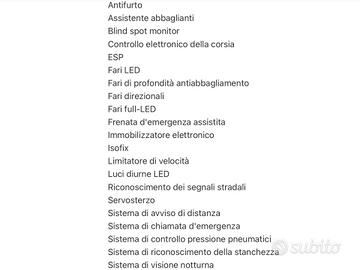 TOP SALES AUTOMOTIVE GROUP . VISITA NS SITO WEB TOPSALESAUTOMOTIVE.COM X NUOVE OFFERTE ( 150 AUTO DISPONIBILI ) VISITA NS SHOP AUTO SUBITO .IT X NUOVE OFFERTE ( 35 AUTO DISPONIBILI ) . CITROËN C4 X 1.2 PURETEK PLUS. AUTOMATICA . AUTO PARI AL NUOVO 15 KM . NESUN INTERVENTO DA ESEGUIRE . TAGLIANDATA . TAGLIANDI CERTIFICATI. FULL OPTIONAL . VEDI DATI COMPLETI ALLEGATI . PER OGNI INFORMAZIONE CONTATTARE ORARI UFFICI NS STAFF COMMERCIALE . O LASCIARE VS RECAPITO TELEFONICO O E-MAIL SARETE RICONTATTATI A BREVE . TOP SALES AUTOMOTIVE GROUP . ABS Airbag laterali Antifurto Chiusura centralizzata Fendinebbia Pretensionatore cinture Airbag per la testa Fari anteriori allo xeno (a scarica di gas) Riconoscimento segnali stradali Monitoraggio angolo cieco Fari adattativi Riconoscimento pedone Isofix Chiusura centralizzata senza chiave Immobilizzatore elettronico Sistema di chiamata d'emergenza Sistema di riconoscimento della stanchezza Airbag guida Airbag passeggero Chiave con transponder Controllo elettronico della stabilità Immobilizzatore Controllo elettronico della trazione Airbag per le ginocchia Controllo automatico adattivo della velocità Fari anteriori a LED Avviso del cambio di corsia Frenata automatica di emergenza Airbag posteriore Controllo elettronico della corsia Luci diurne LED Sistema di controllo pressione pneumatici Sistema di visione notturna Luci diurne Appoggiatesta posteriori Climatizzatore Correttore assetto fari Lavatergifari Retrovisori elettrici termici Ricircolo aria Sedili regolabili elettricamente Sospensioni autoregolabili Vetri elettrici anteriori Volante regolabile Interni in materiale pregiato Sensore luci Hill Holder Controllo automatico clima Volante in pelle Leve al volante Interni in pelle Cambio automatico Controllo automatico velocità Indicatore temperatura esterna Retrovisori elettrici Retrovisori ripiegabili elettricamente Sedile guida regolabile in altezza Servos
