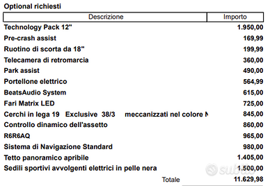 Vendo come da titolo Cupra Formentor 2.0 tdi 150cv, cambio dsg con trazione integrale 4x4, immatricolata 08/2023. Non è il solito allestimento base ma comprende, al netto del gancio traino, tutti gli accessori che erano presenti sul configuratore, parliamo di 12000€. La vettura in questa configurazione costava circa 52000€ di listino. Gli optional più esclusivi sono, tettuccio apribile (introvabile), sospensioni elettroniche, fari matrix (non sono i classici lenticolari) e impianto audio Beats Optional: Technology Pack 12"1.950,00 € Pre-crash assist169,99 € Ruotino di scorta da 18"199,99 € Telecamera di retromarcia360,00 € Park assist490,00 € Portellone elettrico564,99 € BeatsAudio System615,00 € Fari Matrix LED725,00 € Cerchi in lega 19 Exclusive 38/3 meccanizzati nel colore N845,00 € Controllo dinamico dell'assetto860,00 € R6R6AQ965,00 € Sistema di Navigazione Standard980,00 € Tetto panoramico apribile1.405,00 € Sedili sportivi avvolgenti elettrici in pelle nera1.500,00 € Totale11.629,98 € L'auto si presenta in condizioni impeccabili, per intenderci il volante è ancora opaco, risulta ancora in garanzia, tagliandi certificati. Verrà venduta con le gomme estive nuove, ad oggi monta le termiche che verranno cedute a corredo. Se interessati contattatemi senza impegno, ho altre foto e video da inviare per Vostre valutazioni. Giorgio 345-7260503