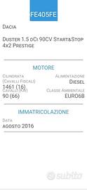 ISSIMA!!! TENUTA SEMPRE IN GARAGE - DACIA Duster 1.5 dCi 4x2 START&STOP PRESTIGE- FOTO FATTURE LAVORI-- L'AUTO HA PERCORSO CIRCA 9000 KM ALL'ANNO!!! UNICO PROPRIETARIO, EURO 6B. FOTO ULTIME 3 REVISIONI- KM 96000 "ASSOLUTAMENTE O-RI-GI-NA-LI", NIENTE TARGHE NASCOSTE!! QUALSIASI VERIFICA. SE RICHIESTO INVIO COPIA LIBRETTO CIRC. FOTO ULTIMA REVISIONE FATTA LI 08-2024 A KM 83000. CARROZZERIA TAPPEZZERIA E MECCANICA IN OTTIME CONDIZIONI. Cilindrata 1500 dCi , KW 66- CV 90. NAVIGATORE, CLIMATIZZATORE, COMANDI AL VOLANTE, ABS, AIRBAG, RADIO TOUCH CON AUX-USB-NAVIGATORE E BLUETOOTH DI SERIE, COMPUTER, START&STOP, HILL HOLDER, sistema elettronico, gestito dall'ESP, che assiste automaticamente il guidatore nelle partenze in salita, SENSORI PARCHEGGIO POST.- SPECCHI ESTERNI ELETTRICI, 4 ALZAVETRI ELETTRICI, BRACCIOLO ANT,--TELECOMANDO APRIPORTA E 2' CHIAVE, SEDILI POST. SDOPPIABILI, CERCHI IN LEGA DA 16' CON GOMME NUOVE ESTIVE, RUOTA DI SCORTA. Interni molto curati, Igienizzati Professionalmente, Non Fumatore, scrupoloso controllo generale prima della consegna, 1 ANNO DI GARANZIA, QUALSIASI PROVA, TUTTA FINANZIABILE. -----ANCHE FINANZIAMENTO A RATE FINO A 5000,00 SENZA BUSTA PAGA, ANCHE SENZA NESSUN REDDITO!!!! La Nostra Attivita' ci coinvolge con una grande passione ultratrentennale. Facilmente Raggiungibili a 1km dall'uscita Tolentino Ovest della superstrada Civitanova Marche - Foligno. a 5 min dalla Stazione FFSS di TOLENTINO.