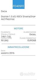 LLISSIMA!!! TENUTA SEMPRE IN GARAGE - DACIA Duster 1.5 dCi 4x2 START&STOP PRESTIGE- FOTO FATTURE LAVORI-- L'AUTO HA PERCORSO CIRCA 9000 KM ALL'ANNO!!! UNICO PROPRIETARIO, EURO 6B. FOTO ULTIME 3 REVISIONI- KM 96000 "ASSOLUTAMENTE O-RI-GI-NA-LI", NIENTE TARGHE NASCOSTE!! QUALSIASI VERIFICA. SE RICHIESTO INVIO COPIA LIBRETTO CIRC. FOTO ULTIMA REVISIONE FATTA LI 08-2024 A KM 83000. CARROZZERIA TAPPEZZERIA E MECCANICA IN OTTIME CONDIZIONI. Cilindrata 1500 dCi , KW 66- CV 90. NAVIGATORE, CLIMATIZZATORE, COMANDI AL VOLANTE, ABS, AIRBAG, RADIO TOUCH CON AUX-USB-NAVIGATORE E BLUETOOTH DI SERIE, COMPUTER, START&STOP, HILL HOLDER, sistema elettronico, gestito dall'ESP, che assiste automaticamente il guidatore nelle partenze in salita, SENSORI PARCHEGGIO POST.- SPECCHI ESTERNI ELETTRICI, 4 ALZAVETRI ELETTRICI, BRACCIOLO ANT,--TELECOMANDO APRIPORTA E 2' CHIAVE, SEDILI POST. SDOPPIABILI, CERCHI IN LEGA DA 16' CON GOMME NUOVE ESTIVE, RUOTA DI SCORTA. Interni molto curati, Igienizzati Professionalmente, Non Fumatore, scrupoloso controllo generale prima della consegna, 1 ANNO DI GARANZIA, QUALSIASI PROVA, TUTTA FINANZIABILE. -----ANCHE FINANZIAMENTO A RATE FINO A 5000,00 SENZA BUSTA PAGA, ANCHE SENZA NESSUN REDDITO!!!! La Nostra Attivita' ci coinvolge con una grande passione ultratrentennale. Facilmente Raggiungibili a 1km dall'uscita Tolentino Ovest della superstrada Civitanova Marche - Foligno. a 5 min dalla Stazione FFSS di TOLENTINO.