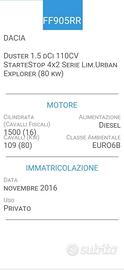 CO PROPRIETARIO--TUTTI TAGLIANDI IN OFFICINA RENAULT / DACIA --CINTA DISTRIBUZIONE COMPLETA FATTA A KM 64000--DACIA Duster 1.5 dCi 4x2 START&STOP SERIE LIMIT. URBAN EXSPLORER FAMILY SPECIAL EDITION-- L'AUTO HA PERCORSO CIRCA 000 KM ALL'ANNO!!! - EURO 6B. FOTO ULTIME 3 REVISIONI--FOTO ULTIMA REVISIONE FATTA LI 11-2024 A KM 70000-- FOTO ULTIMO TAGLIANDO OLIO E FILTRI APPENA FATTO ALLA RENAULT LI 10-2024 A KM 80000-- KM 81000 "ASSOLUTAMENTE O-RI-GI-NA-LI", NIENTE TARGHE NASCOSTE!! QUALSIASI VERIFICA. SE RICHIESTO INVIO COPIA LIBRETTO CIRC. CARROZZERIA TAPPEZZERIA E MECCANICA IN OTTIME CONDIZIONI. Cilindrata 1500 dCi , KW 80- CV 109. CLIMATIZZATORE, COMANDI AL VOLANTE, ABS, AIRBAG, RADIO TOUCH- CON AUX- USB- NAVIGATORE E BLUETOOTH DI SERIE, COMPUTER, START&STOP, HILL HOLDER, sistema elettronico, gestito dall'ESP, che assiste automaticamente il guidatore nelle partenze in salita, SENSORI PARCHEGGIO POST.- SPECCHI ESTERNI ELETTRICI, 4 ALZAVETRI ELETTRICI-- 2 TELECOMANDI APRIPORTA, SEDILI POST. SDOPPIABILI, BATTERIA 06-2024, CERCHI IN LEGA DA 16' CON GOMME FULDA NUOVE 4 STAGIONI, RUOTA DI SCORTA. Interni molto curati, Igienizzati Professionalmente, Non Fumatore, scrupoloso controllo generale prima della consegna, 1 ANNO DI GARANZIA, QUALSIASI PROVA, TUTTA FINANZIABILE. -----ANCHE FINANZIAMENTO A RATE FINO A 5000,00 SENZA BUSTA PAGA, ANCHE SENZA NESSUN REDDITO!!!! La Nostra Attivita' ci coinvolge con una grande passione ultratrentennale. Facilmente Raggiungibili a 1km dall'uscita Tolentino Ovest della superstrada Civitanova Marche - Foligno. a 5 min dalla Stazione FFSS di TOLENTINO.