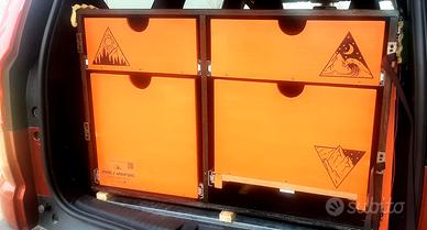 -Camping box nel bagagliaio con 4 cassettoni, di cui uno con cucina da 1 metro di profondità completa di lavello e tavolino scorrevole (sporgenza totale dall’auto 2 metri). Gli altri cassetti 2 sono per i vestiti (Niente Trolley in macchina), e l'altro è un gavone da 1 metro di profondità per oggettistica varia.