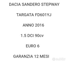 PRONTA CONSEGNA DACIA SANDERO STEPWAY ANNO 2016 EURO 6 GARANZIA 12 MESI 1.5 DCI 90 CV KM 107562 CERTIFICATI UNICO PROPRIETARIO 2 CHIAVI DI ACCENSIONE PROVENIENZA NORD ITALIA OPTIONAL ABS Airbag laterali Chiusura centralizzata Fendinebbia Airbag guida Airbag passeggero Climatizzatore Correttore assetto fari Vetri elettrici anteriori Volante regolabile Controllo automatico velocità Retrovisori elettrici Sedile guida regolabile in altezza Servosterzo Tergilunotto Vetri elettrici posteriori Navigatore satellitare di serie Filtro anti particolato Sedile posteriore sdoppiato E TANTISSIMI ALTRI ACCESSORI PER INFOAUTOCARLEOVIA APPIA KM 1960080014 GIUGLIANO IN CAMPANIA TEL. -