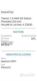 DAIHATSU TERIOS-1300-4X4 GPL-UNICA PROPRIETARIA-FOTO ULTIME 3 REVISIONI - OK NEOPATENTATI - KM 208000 ( ha percorso circa 11000 km all'anno!!!) "ASSOLUTAMENTE O-RI-GI-NA-LI" NIENTE TARGHE NASCOSTE!! QUALSIASI VERIFICA. SE RICHIESTO INVIO COPIA LIBRETTO CIRC.- FOTO IMPIANTO GPL LANDI RENZO MONTATO NEL 2018, SCADENZA BOMBOLA DA 35 LITRI NEL 2028, FOTO ULTIMA REVISIONE FATTA LI 04-2024 A KM 205000 - Cilindrata 1300 KW 63-CV 86 - CLIMATIZZATORE, ABS, AIRBAG, RADIO CD, SENSORI PARCHEGGIO ANTERIORI E POSTERIORI -4 ALZAVETRI ELETTRICI, SPECCHI ESTERNI ELETTRICI, TELECOMANDO APRIPORTE E 2' CHIAVE, SEDILE POST. SDOPPIABILE, RUOTA DI SCORTA ESTERNA, CERCHI IN LEGA DA 16', GOMME 4 STAGIONI SEMINUOVE. Interni molto curati, Igienizzati Professionalmente, Non Fumatore, scrupoloso controllo generale prima della consegna, QUALSIASI PROVA, TUTTA FINANZIABILE. La Nostra Attivita' ci coinvolge con una grande passione ultratrentennale. Facilmente Raggiungibili a 1km dall'uscita Tolentino Ovest della superstrada Civitanova Marche - Foligno. a 5 min dalla Stazione FFSS di TOLENTINO.