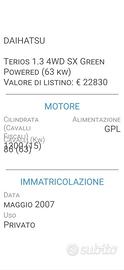 IHATSU TERIOS-1300-4X4 GPL-UNICA PROPRIETARIA-FOTO ULTIME 3 REVISIONI - OK NEOPATENTATI - KM 208000 ( ha percorso circa 11000 km all'anno!!!) "ASSOLUTAMENTE O-RI-GI-NA-LI" NIENTE TARGHE NASCOSTE!! QUALSIASI VERIFICA. SE RICHIESTO INVIO COPIA LIBRETTO CIRC.- FOTO IMPIANTO GPL LANDI RENZO MONTATO NEL 2018, SCADENZA BOMBOLA DA 35 LITRI NEL 2028, FOTO ULTIMA REVISIONE FATTA LI 04-2024 A KM 205000 - Cilindrata 1300 KW 63-CV 86 - CLIMATIZZATORE, ABS, AIRBAG, RADIO CD, SENSORI PARCHEGGIO ANTERIORI E POSTERIORI -4 ALZAVETRI ELETTRICI, SPECCHI ESTERNI ELETTRICI, TELECOMANDO APRIPORTE E 2' CHIAVE, SEDILE POST. SDOPPIABILE, RUOTA DI SCORTA ESTERNA, CERCHI IN LEGA DA 16', GOMME 4 STAGIONI SEMINUOVE. Interni molto curati, Igienizzati Professionalmente, Non Fumatore, scrupoloso controllo generale prima della consegna, QUALSIASI PROVA, TUTTA FINANZIABILE. La Nostra Attivita' ci coinvolge con una grande passione ultratrentennale. Facilmente Raggiungibili a 1km dall'uscita Tolentino Ovest della superstrada Civitanova Marche - Foligno. a 5 min dalla Stazione FFSS di TOLENTINO.
