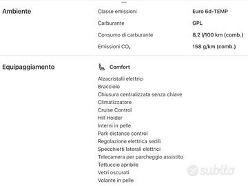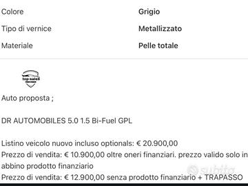 TOP SALES AUTOMOTIVE GROUP . VISITA NS SITO WEB TOPSALESAUTOMOTIVE.COM X NUOVE OFFERTE ( 150 AUTO DISPONIBILI ) VISITA NS SHOP AUTO SUBITO .IT X NUOVE OFFERTE ( 35 AUTO DISPONIBILI ) . DR 5.0 1.5 BI - FUELL GPL PERFETTA . NESUN INTERVENTO DA ESEGUIRE . CONSUMI RIDOTTI . TAGLIANDATA . TAGLIANDI CERTIFICATI . FULL OPTIONAL . VEDI DETTAGLI ALLEGATI . PER OGNI INFORMAZIONE CONTATTARE ORARI UFFICI . O LASCIARE VS RECAPITO TELEFONICO O E-MAIL SARETE RICONTATTATI A BREVE . TOP SALE AUTOMOTIVE GROUP . ABS Airbag laterali Antifurto Chiusura centralizzata Fendinebbia Airbag per la testa Fari anteriori allo xeno (a scarica di gas) Fari adattativi Isofix Airbag guida Airbag passeggero Immobilizzatore Controllo automatico adattivo della velocità Fari anteriori a LED Luci diurne LED Sistema di controllo pressione pneumatici Sistema di visione notturna Luci diurne Appoggiatesta posteriori Correttore assetto fari Retrovisori elettrici termici Ricircolo aria Vetri elettrici anteriori Volante regolabile Interni in materiale pregiato Vernice metallizzata Sensore luci Hill Holder Controllo automatico clima Volante in pelle Interni in pelle Controllo automatico velocità Indicatore temperatura esterna Retrovisori elettrici Retrovisori ripiegabili elettricamente Sedile guida regolabile in altezza Servosterzo Tergilunotto Vetri elettrici posteriori Sensore pioggia Bracciolo sedili anteriori Head-up display Start/Stop Automatico Parabrezza riscaldato Sensore di luminosità Supporto lombare Volante multifunzione Tempomat Riscaldamento ausiliario Autoradio Bluetooth Radio DAB Lettore MP3 Computer di bordo Sound system USB Navigatore satellitare Connessione dati Keyless System Lettore CD Sistema di navigazione Touch screen Vivavoce Cambio manuale Check panel Deflettori Full Optional Vetri oscurati (edited) Cerchi in lega Sedile posteriore sdoppiato Veicolo non fumatori Tagliandi certificati Sensori di par